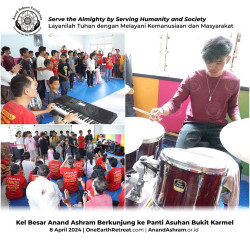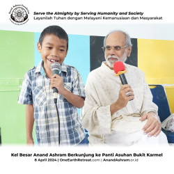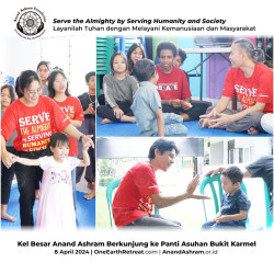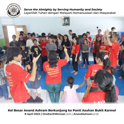 Keluarga Besar Anand Ashram Berkunjung ke Panti Asuhan Bukit Karmel, pada tanggal 8 April 2024. Kegiatan ini sejalan dengan Moto Yayasan Anand Ashram yang digagas oleh Guruji Anand Krishna, yaitu Layanilah Tuhan dengan melayani Kemanusiaan dan Masyarakat.